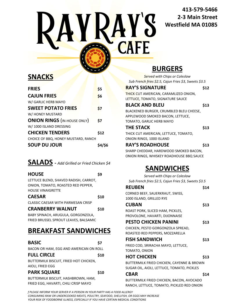 Ray Ray's Cafe in Westfield offers a diverse and flavorful menu that caters to various tastes. For breakfast, Park Square and Full Circle breakfast sandwiches set the tone for a hearty start to your day. For those craving a snack, options like Chicken Wings, Gumbo, Soup of the Day, and Cajun Fries provide satisfying bites. The Fish Sandwich and Hot Chicken Sandwich offer a delicious take on classic favorites, while the CBAR Pesto Chicken Panini and Reuben bring bold flavors to the table. If you're in the mood for a burger, the cafe’s signature creations like The Stack, Roadhouse, and Black and Bleu Ray’s Signature are guaranteed to leave you satisfied. For a lighter option, try the fresh Cranberry Walnut Salad, House Salad, or the rich Caesar Salad. Wash it all down with a refreshing Soda Can. Ray Ray's Cafe’s menu strikes a perfect balance between comfort food and more refined choices, ensuring there's something for everyone.